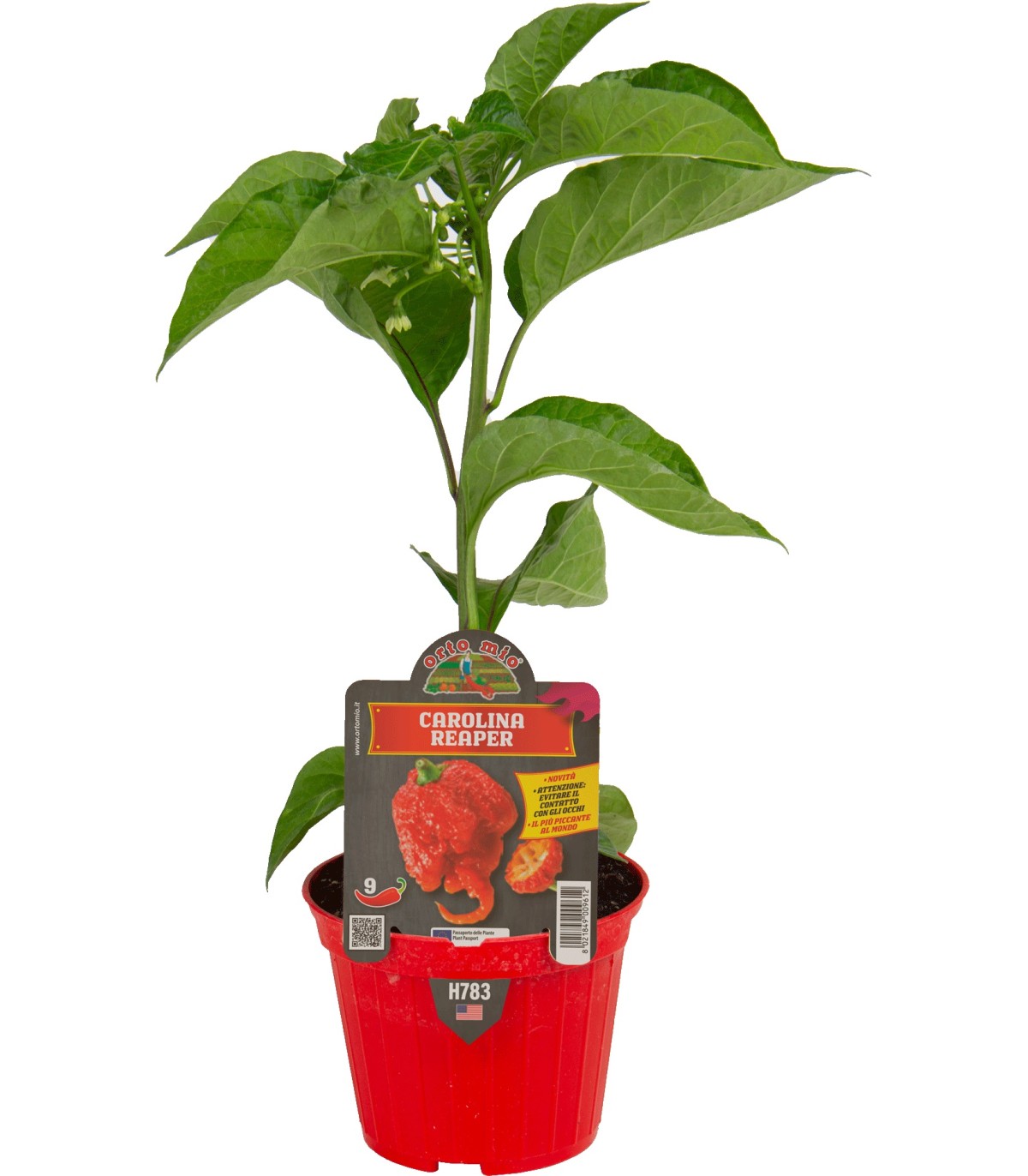 Características: Su nombre está inspirado en una famosa serie de terror estadounidense del mismo nombre, Carolina Reaper. Desde noviembre de 2013 es el chile más picante del mundo. Cruce entre un Naga y un Habanero Rojo. Los frutos en condiciones climáticas óptimas tienen la típica cola curvada del escorpión esperando a abatir a su presa. La planta es vigorosa y requiere apoyo.