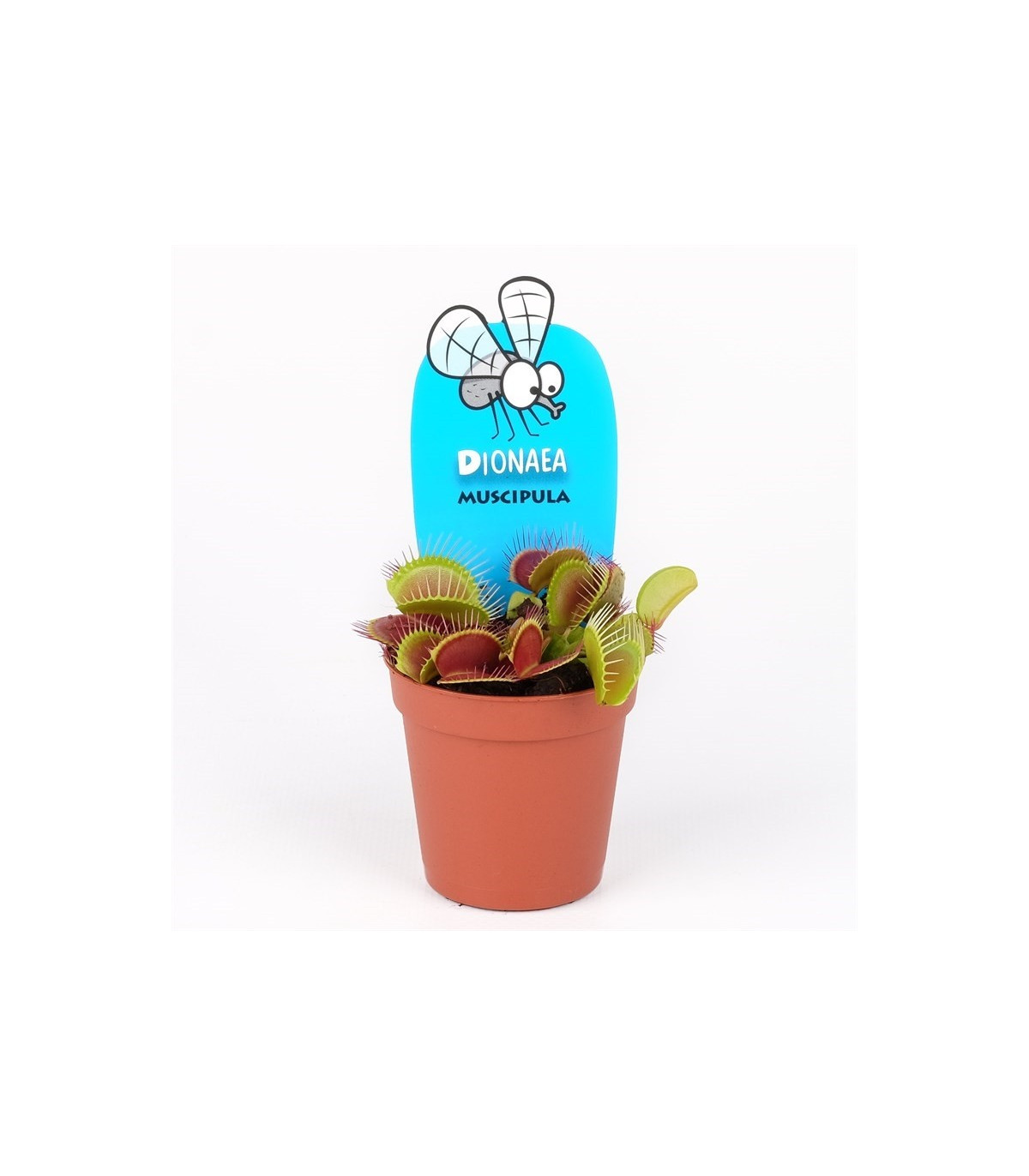 Dionaea muscipula (Venus atrapamoscas) Planta carnívora de interior perenne, se vale de un mecanismo de cepo con pelos sensibles en cada lóbulo para activar el cierre, la trampa incluye barrotes de espinas y solo se activa unas siete veces. Requiere mucha luz directa, alta humedad, temperatura de 0 a 10º de noviembre a marzo y de 20 a 35º el resto del año. La floración la realiza de Mayo a Julio.