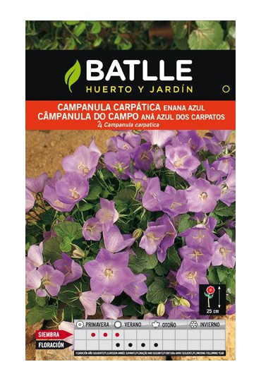 CAMPANULA CARPATICA AZUL: Planta vivaz, altura 25 cms. Siembra: Sembrar en semillero semi sombrío de Abril a Junio, trasplantar a los 2 meses. Floración: Desde Junio a Septiembre del año siguiente. Utilización: Rocallas, borduras y macizos bajos.