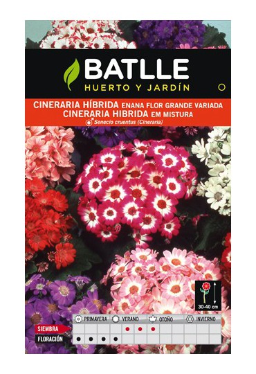 CINERARIA ENANA HÍBRIDA - FLOR GRANDE VDA.): Bisanual. Siembra: Verano, en semillero. Transplantar cuando las plantitas tienen 3-4 hojas. Riegos normales, evitando el exceso de humedad y el encharcamiento. Floración: Primavera. Empleo: Macetas y macizos.