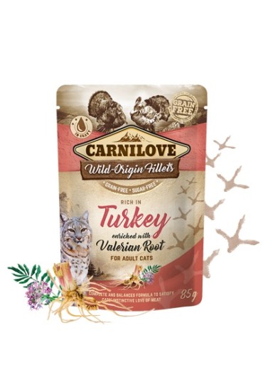85% de carne en filetes (71% de pollo, 14% de pavo), 12% de caldo, 1% de raíz de valeriana, 1% de aceite de linaza, 0,5% de minerales, 0,5% de almidón vegetal.