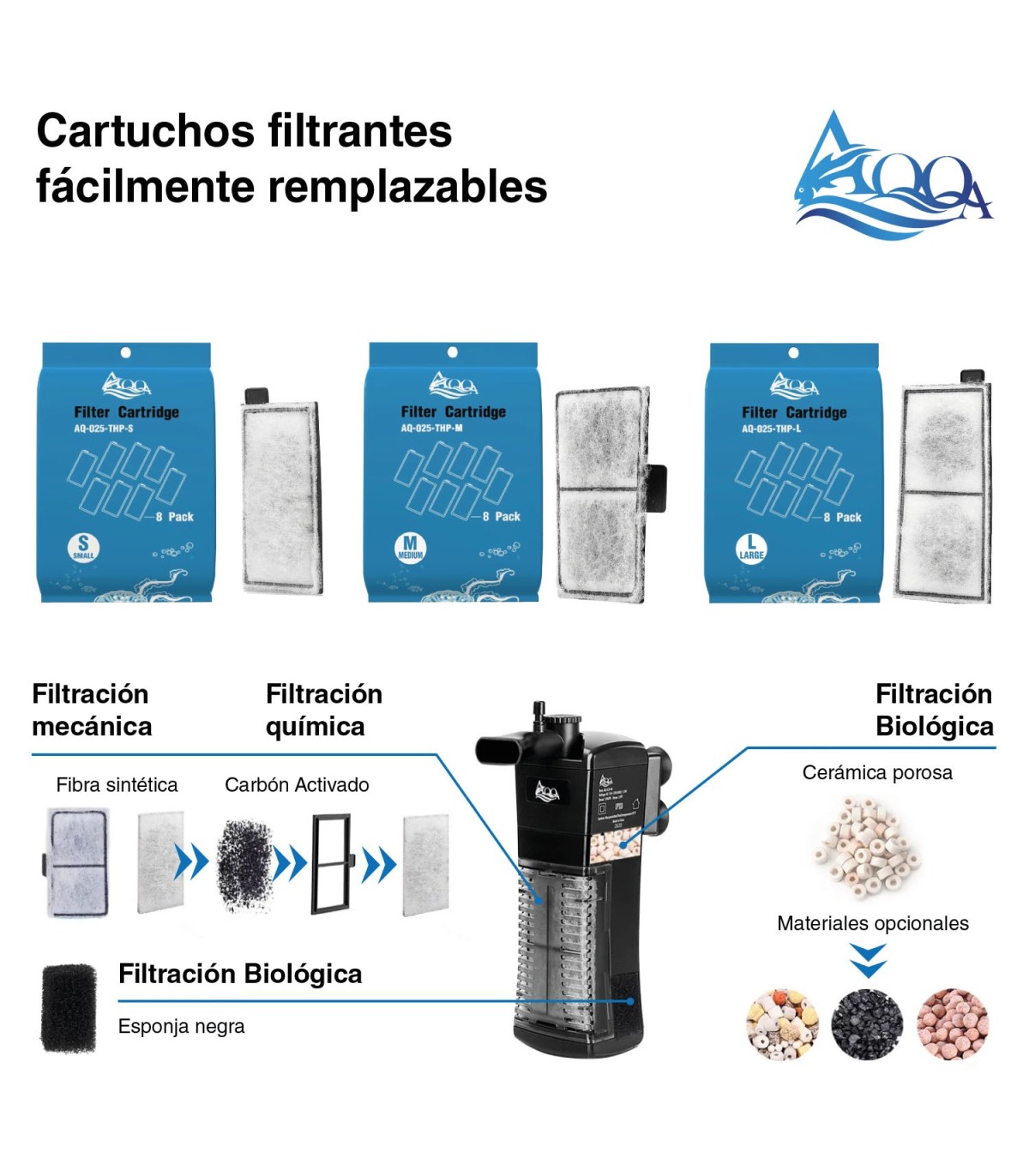 Los filtros interiores AQQA Super Clear 025 ofrecen un servicio de suministro de cartuchos filtrantes para los tres modelos, muy fáciles de sustituir y a un precio económico.