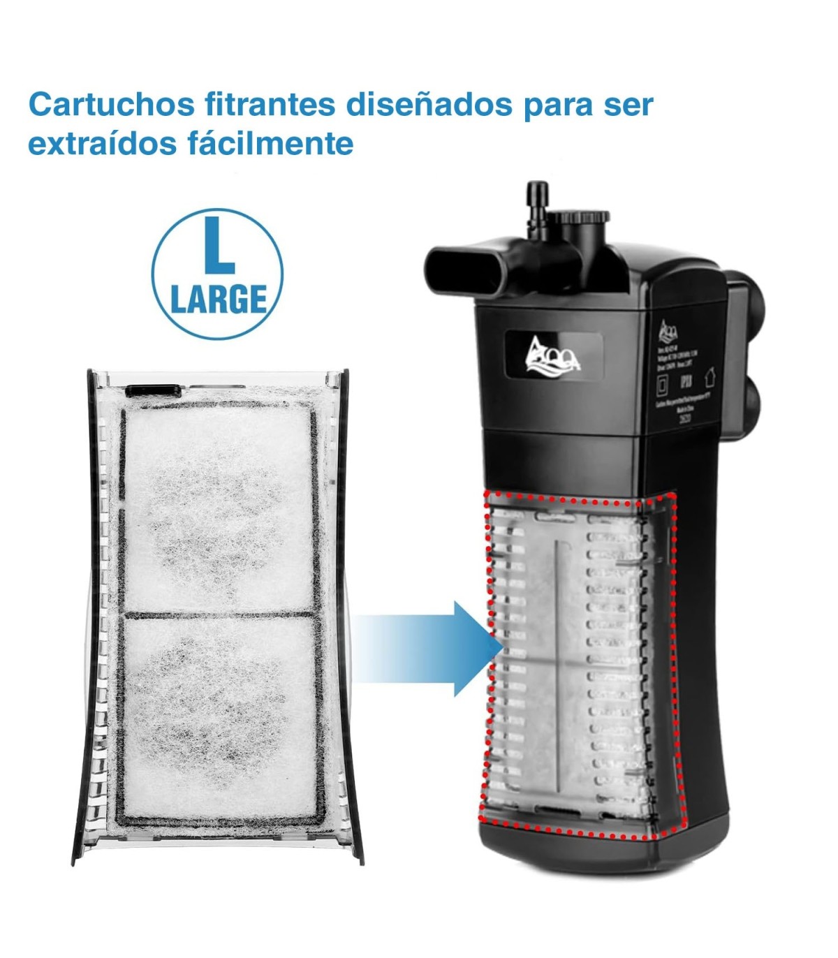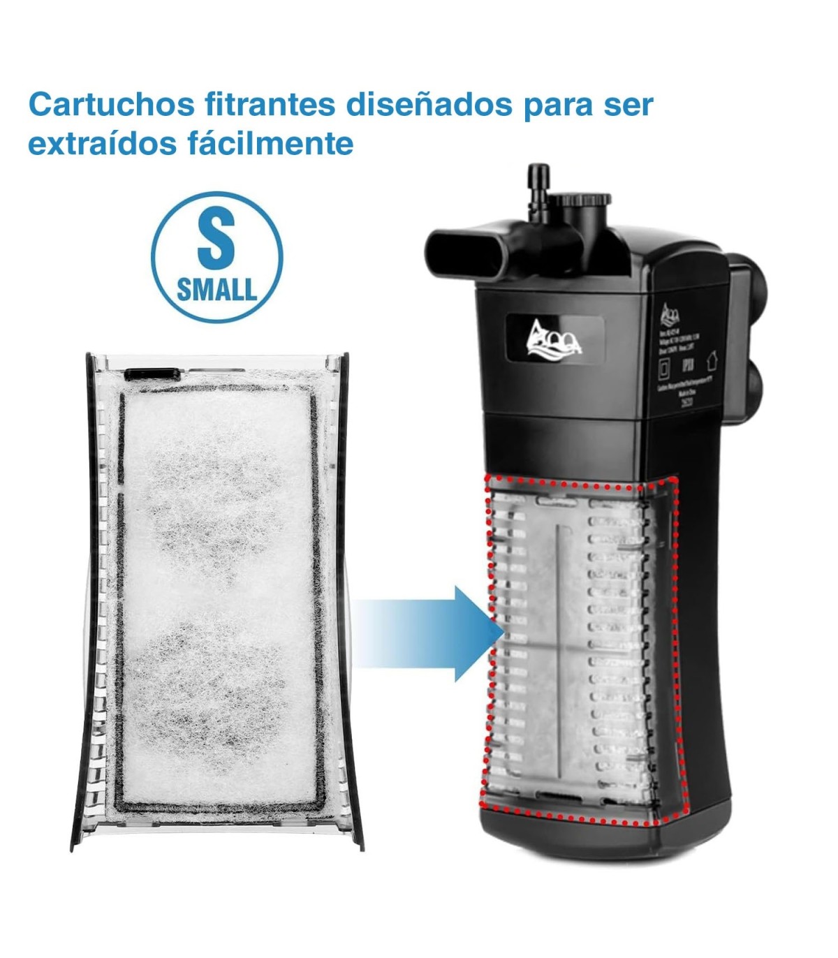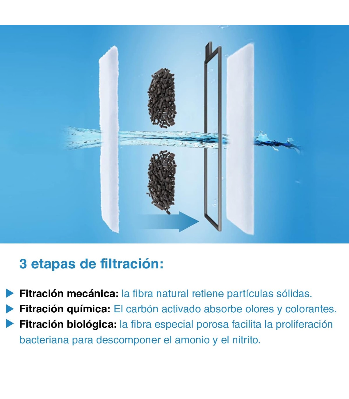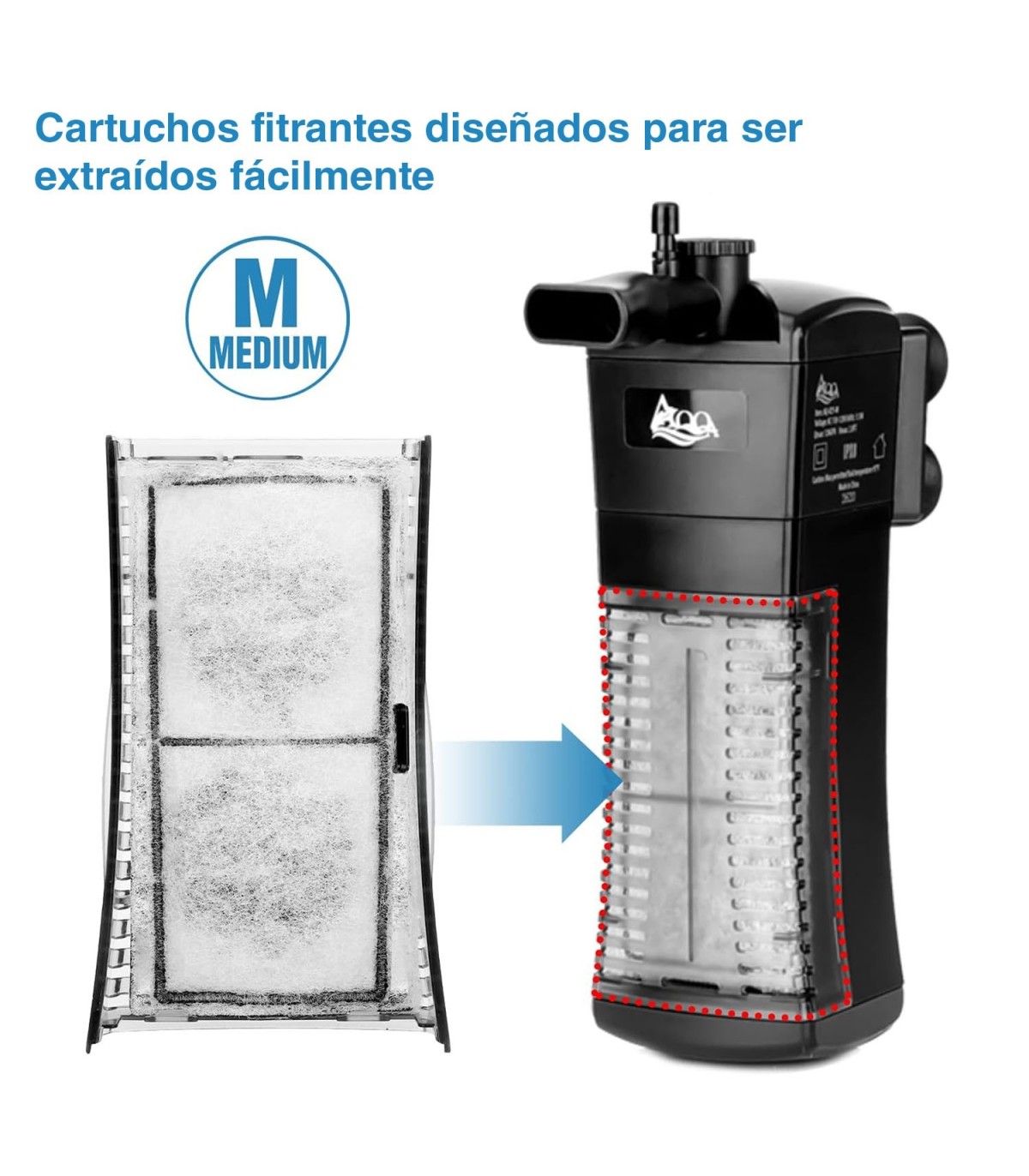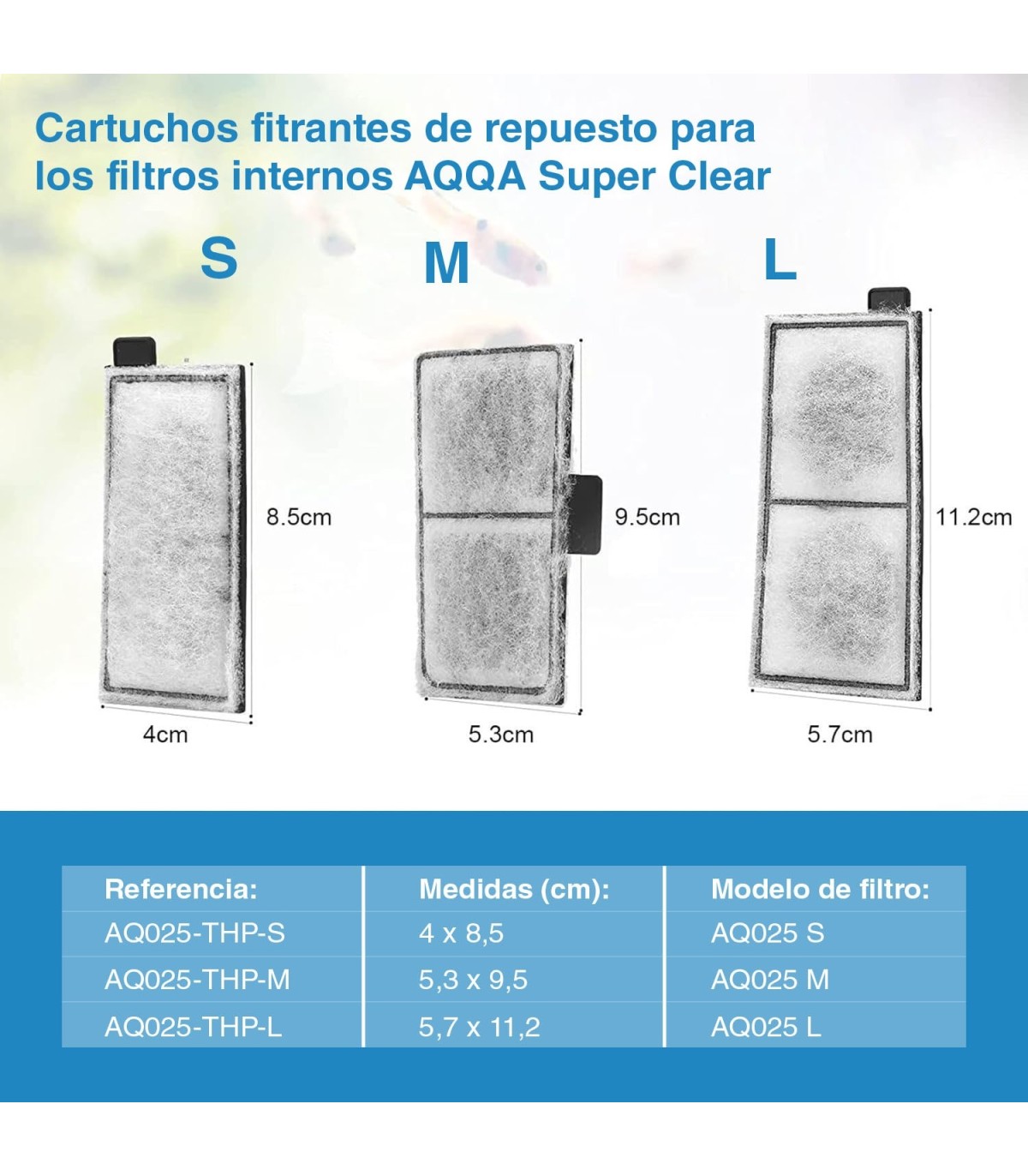 Los Cartuchos de repuesto para Filtros interiores AQQA Super Clear AQ025 Ofrecen un eficiente flujo de agua a través de sus múltiples etapas de filtración, combinando una excelente oxigenación del agua con las funciones básicas de filtración química, biológica y mecánica.