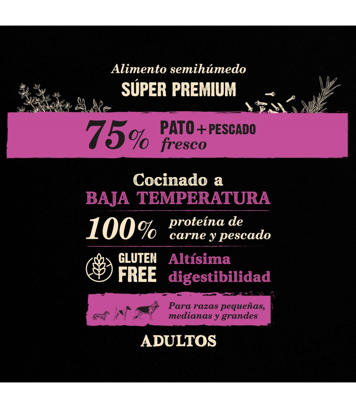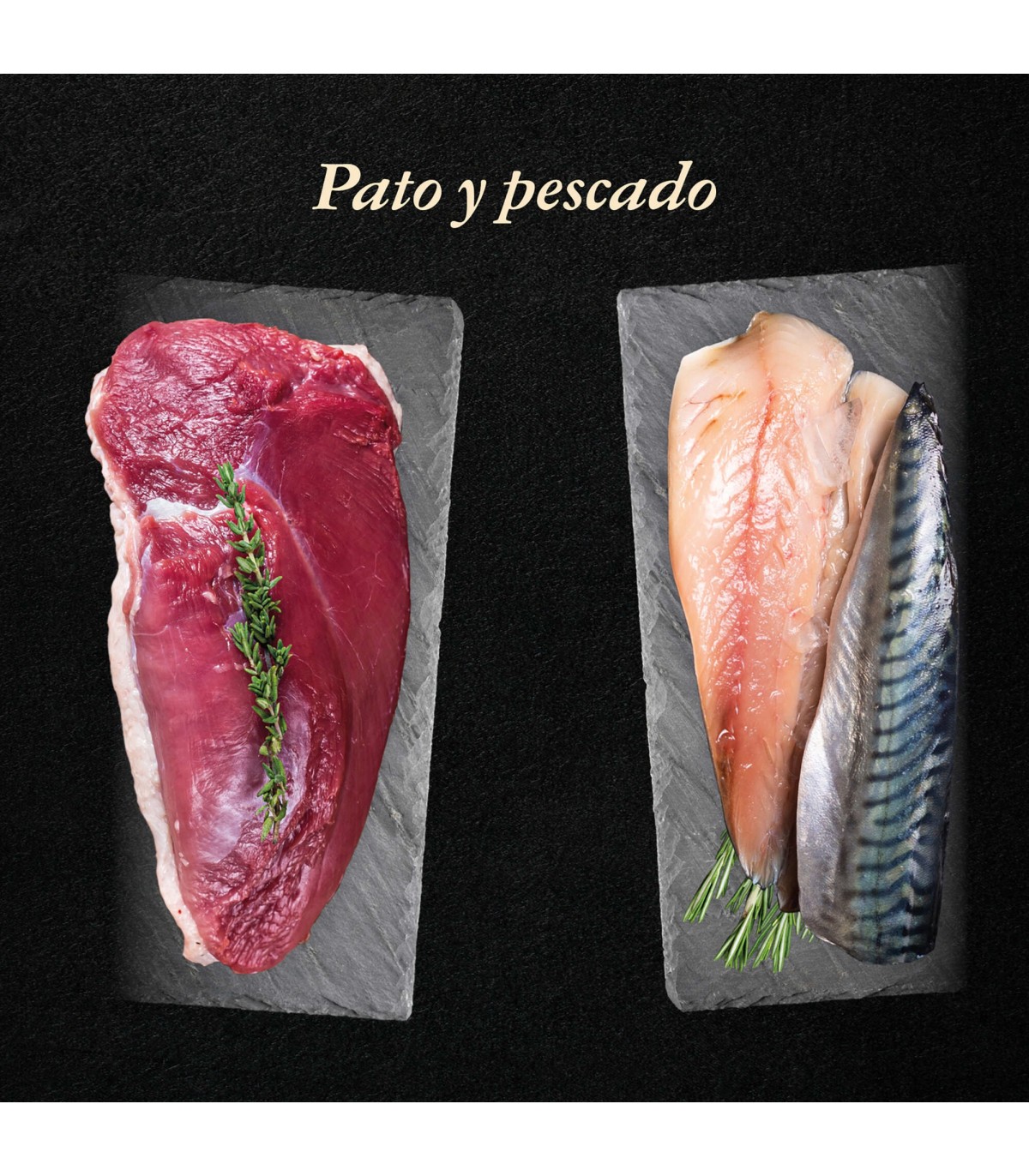 Alimento completo para perros adultos de todas las razas, elaborado con pato y pescado frescos. Deliciosa receta para los paladares más exigentes o para perros con intolerancias alimentarias, gracias a la carne de pato muy sabrosa e hipoalergénica.