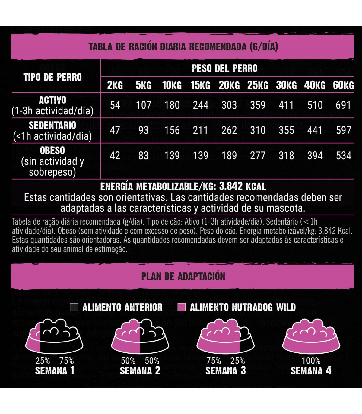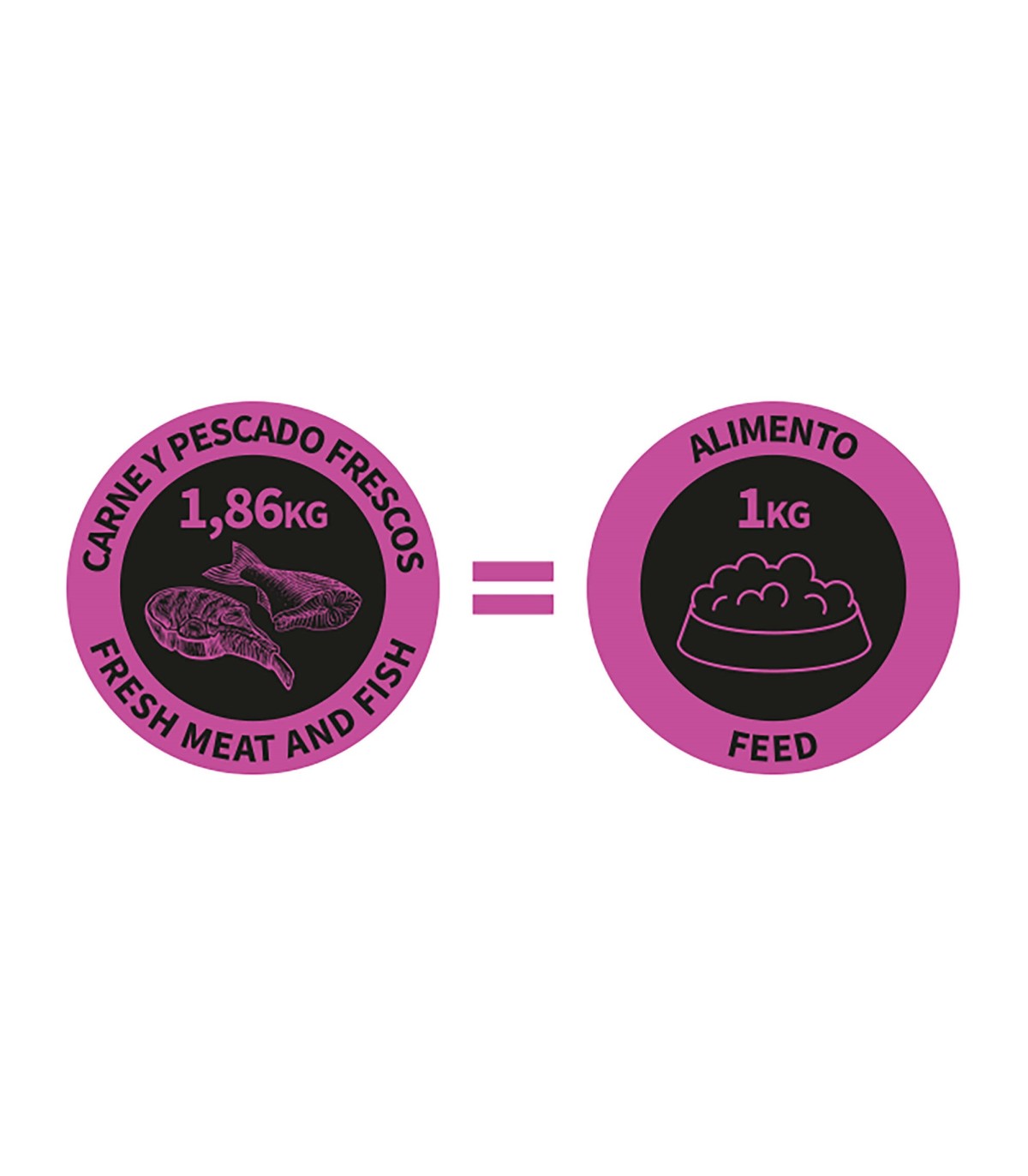 Composición: 55% pato fresco, 20% pescado fresco (alacha (Sardinella aurita), caballa (Scomber scombrus), jurel (Trachurus spp.), sardina (Sardina pilchardus)), almidón hidrolizado, tocoferoles de aceites vegetales, extracto de romero, huevo deshidratado, aceite esencial de orégano, tomillo, clavo, romero, canela Ceylán. ADITIVOS/kg: Vitamina A (3a672a): 22.726 UI, vitamina D3 (3a671): 1.450 UI, vitamina E (3a700): 454 UI, zinc (3b603): 100 mg, hierro (3b103): 72 mg, manganeso (3b503): 36 mg, cobre (3b405): 7,2 mg, yodo (3b201): 1,27 mg.
