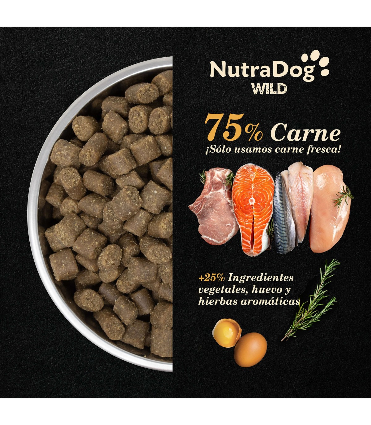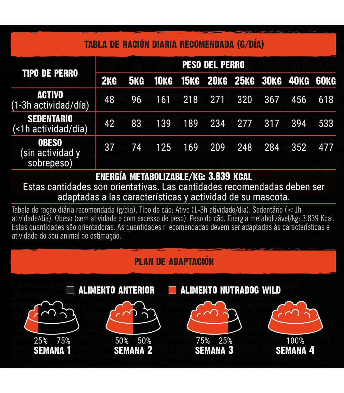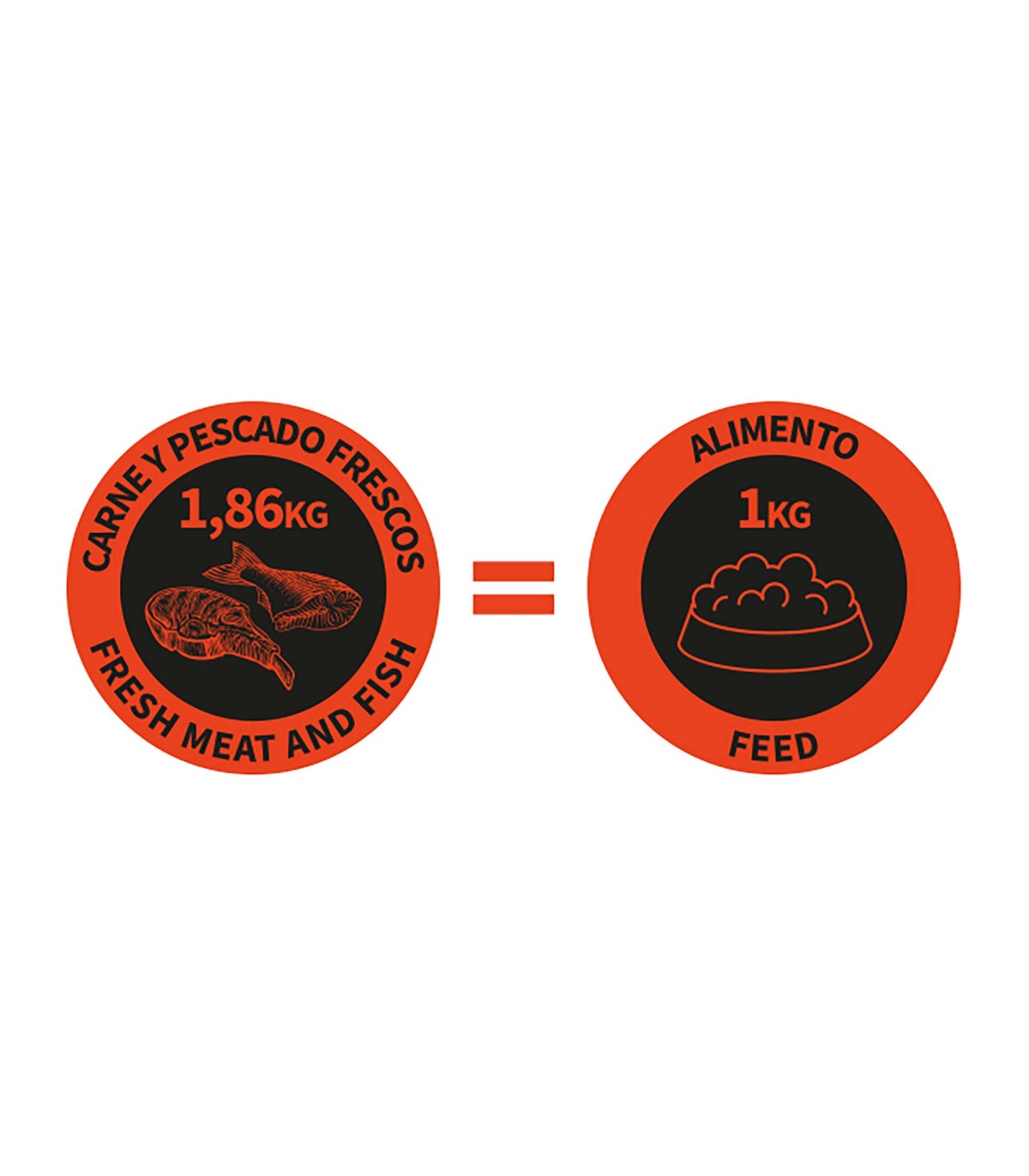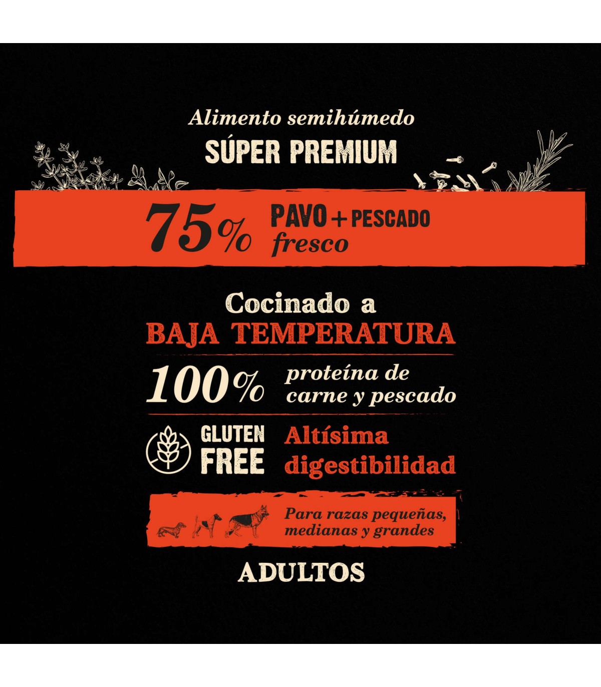 Composición: 55% pavo fresco, 20% pescado fresco (alacha (Sardinella aurita), caballa (Scomber scombrus), jurel (Trachurus spp.), sardina (Sardina pilchardus)), almidón hidrolizado, tocoferoles de aceites vegetales, extracto de romero, huevo deshidratado, aceite esencial de orégano, tomillo, clavo, romero, canela Ceylán. ADITIVOS/kg: Vitamina A (3a672a): 22.726 UI, vitamina D3 (3a671): 1.450 UI, vitamina E (3a700): 454 UI, zinc (3b603): 100 mg, hierro (3b103): 72 mg, manganeso (3b503): 36 mg, cobre (3b405): 7,2 mg, yodo (3b201): 1,27 mg.