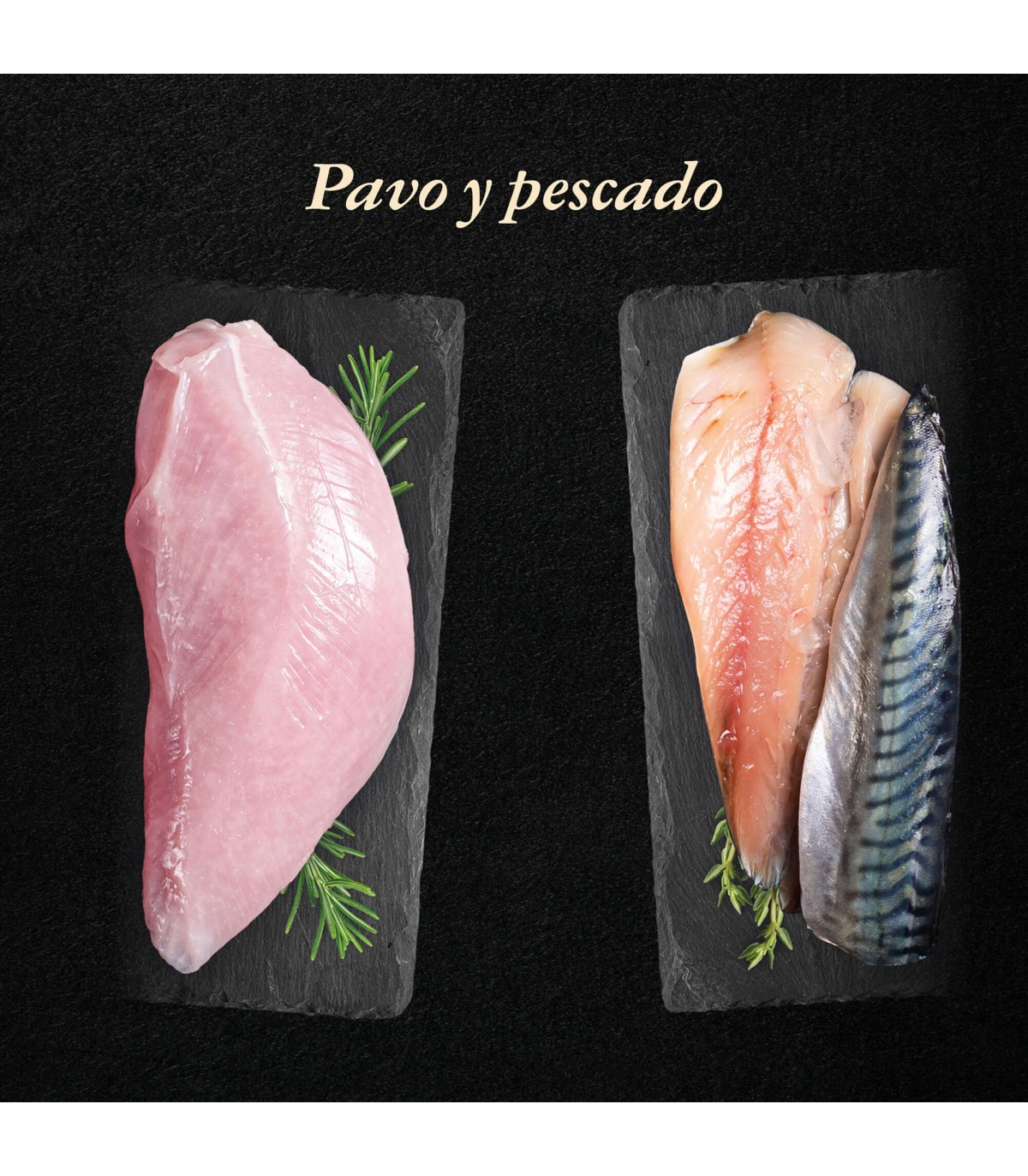 Alimento completo para perros adultos de todas las razas, elaborado con pavo y pescado frescos. Sabrosa fórmula, excelente para perros con digestiones sensibles y tendencia al sobrepeso. Ideal también para perros Senior, gracias a su adecuada cantidad de proteínas, necesarias en las etapas geriátricas, pero moderado