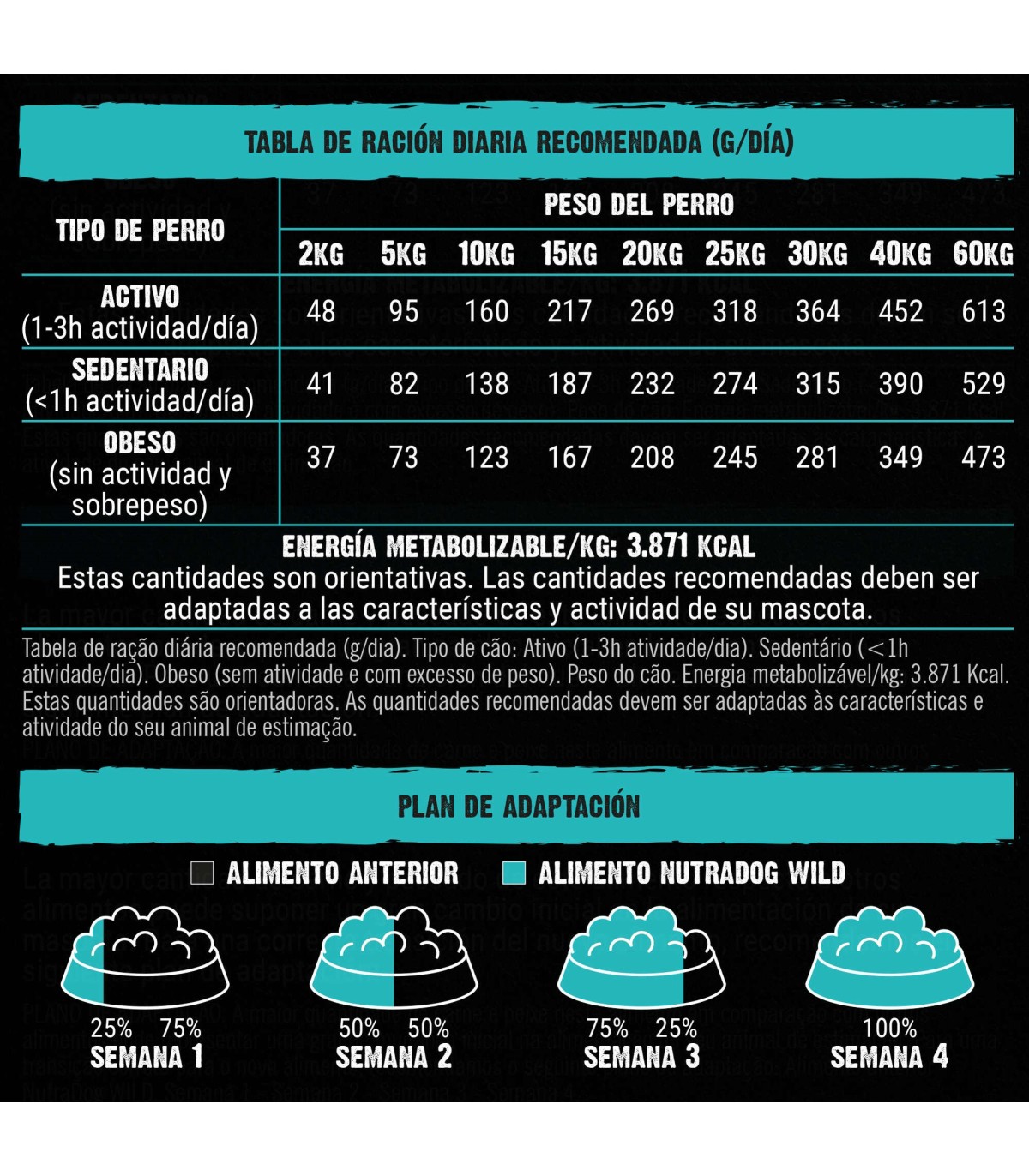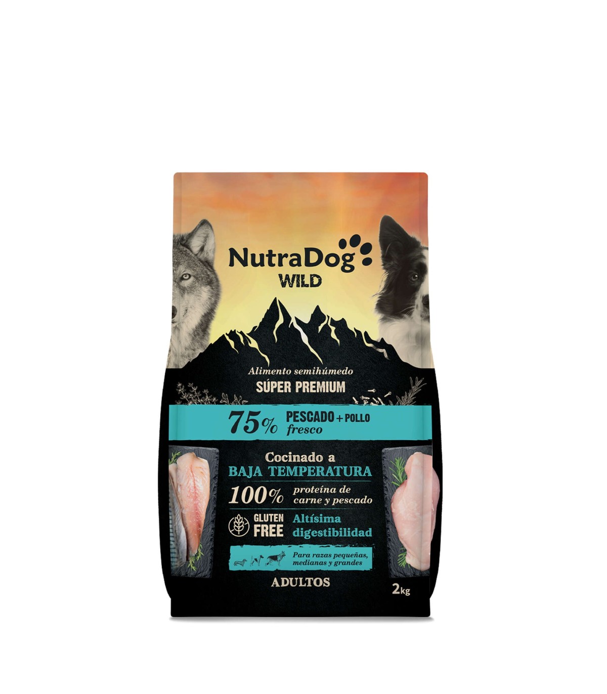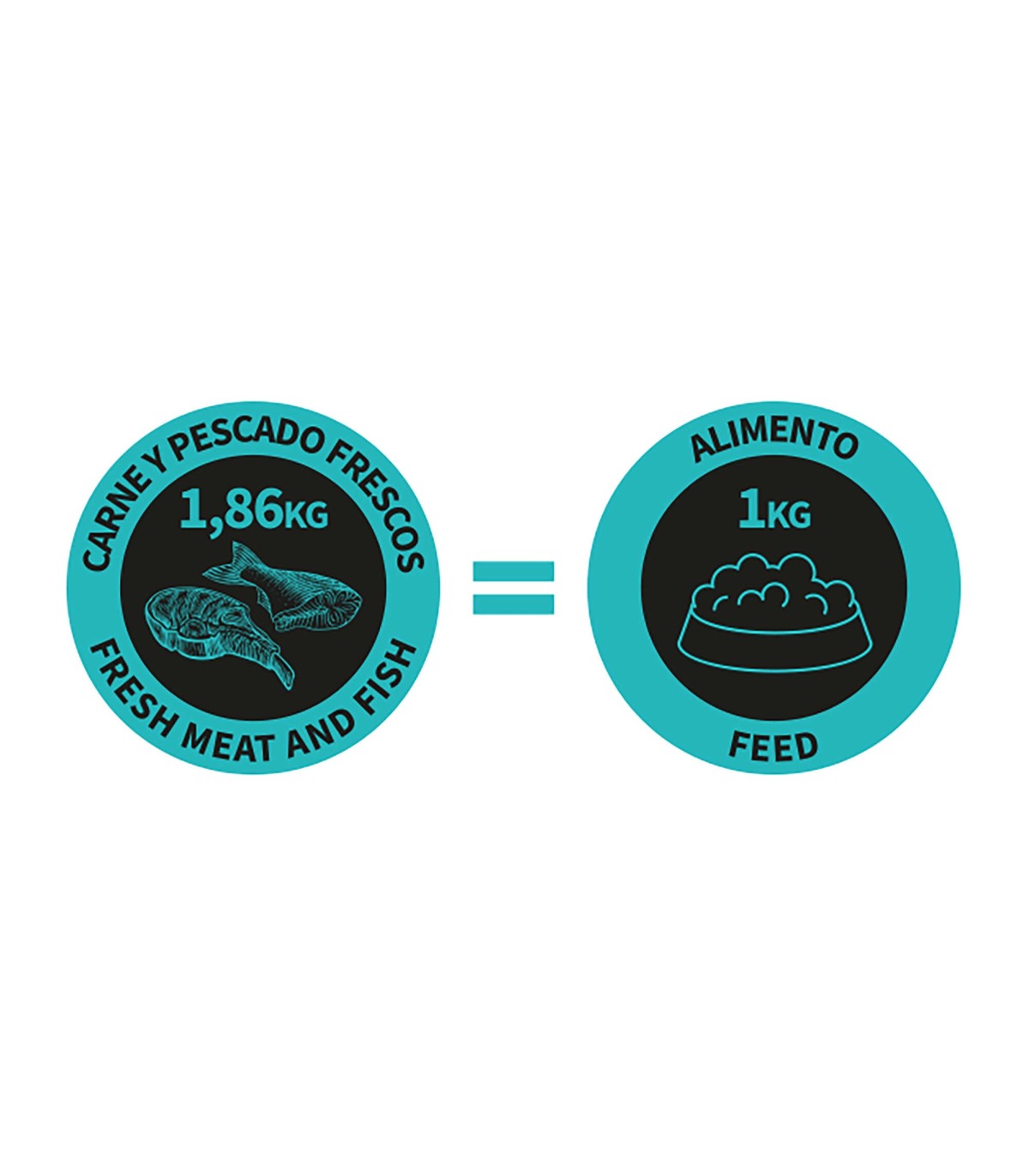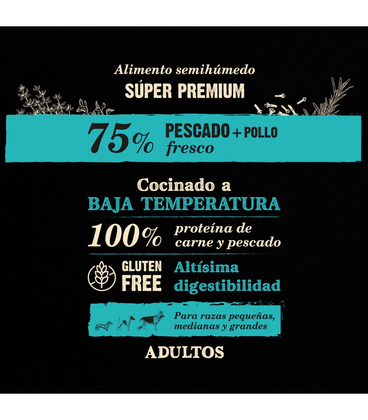 Excelente digestibilidad, Composición: 55% pescado fresco (alacha (Sardinella aurita), caballa (Scomber scombrus), jurel (Trachurus spp.), sardina (Sardina pilchardus)), 20% pollo fresco, almidón hidrolizado, tocoferoles de aceites vegetales, extracto de romero, huevo deshidratado, aceite esencial de orégano, tomillo, clavo, romero, canela Ceylán. ADITIVOS/kg: Vitamina A (3a672a): 22.726 UI, vitamina D3 (3a671): 1.450 UI, vitamina E (3a700): 454 UI, zinc (3b603): 100 mg, hierro (3b103): 72 mg, manganeso (3b503): 36 mg, cobre (3b405): 7,2 mg, yodo (3b201): 1,27 mg.