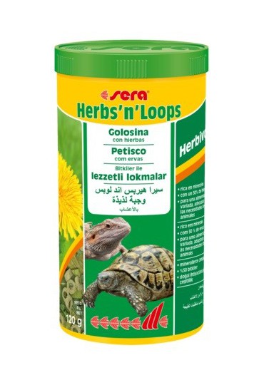 Alimentación variada, adecuada a las necesidades de los animales, con hierbas sabrosas sera Herbs’n’Loops es la golosina que se compone de una mezcla de hierbas secas (un 50%) y anillos cuidadosamente elaborados, para tortugas terrestres y otros reptiles herbívoros. Las hierbas, ricas en oligoelementos y metabolitos secundarios, resultan adecuadas a los hábitos alimentarios naturales de los animales. Gracias a la combinación con anillos, ricos en valiosos nutrientes, vitaminas y minerales, este alimento responde perfectamente a las necesidades de los animales. Si se da regularmente a los animales, esta golosina atractiva favorece el sistema inmunitario, el desarrollo y la vitalidad.