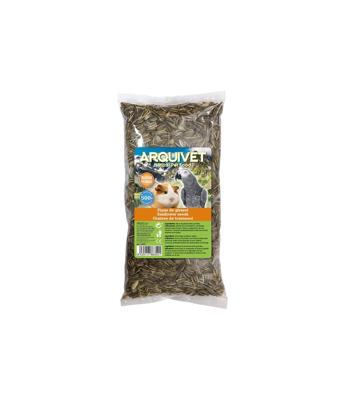 Pipas de girasol para roedores y loros. Complemento alimenticio súper premium para pájaros y roedores. Rico en ácidos grasos insaturados, fuente de hierro y vitaminas, sobre todo vitamina B. Alta apetencia. Peso 500 g.