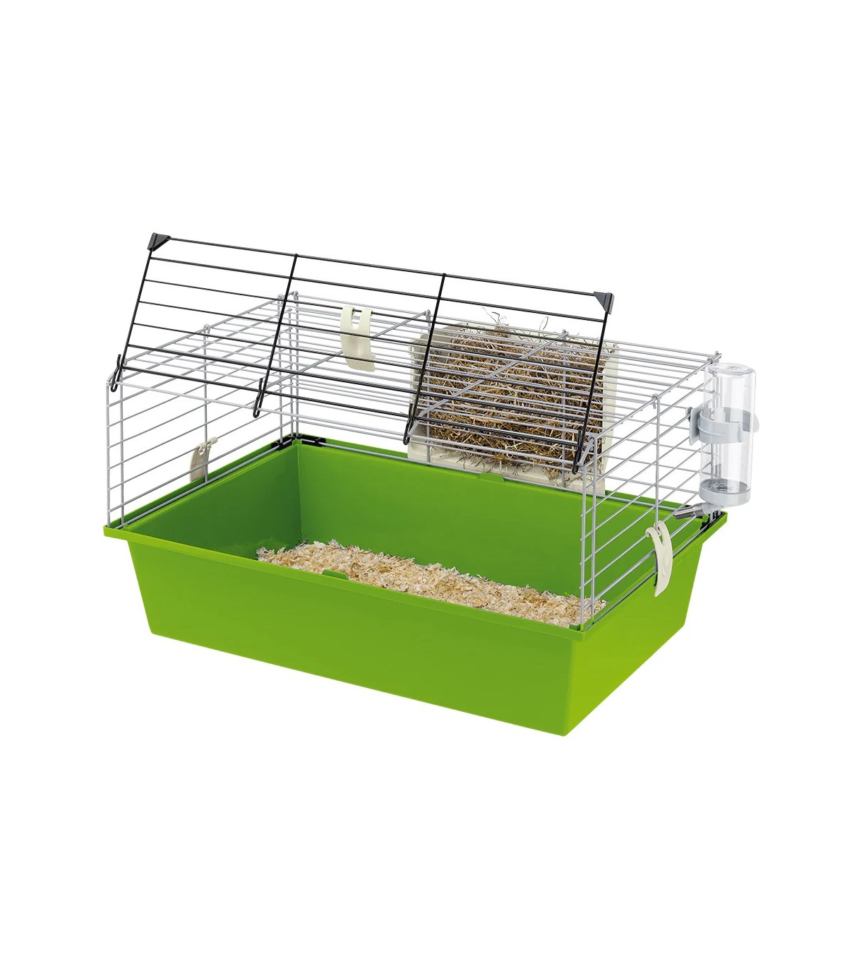 Guinea 60 es una jaula de conejillo de Indias con un reciente renovado sistema de apertura y cierre, garantizando total seguridad para sus mascotas. El hábitat tiene una estructura tradicional con una base de plástico y una estructura de malla de alambre barnizado. En la parte frontal, la puerta puede abrirse completamente, para facilitar la limpieza. Dentro, encontrará accesorios, incluyendo un bebedero y un alimentador plástico para heno. Guinea 60 es un producto ecológico de la gama “ahorro de espacio”. Se vende en un paquete de ahorro de espacio y puede desmontarse completamente.