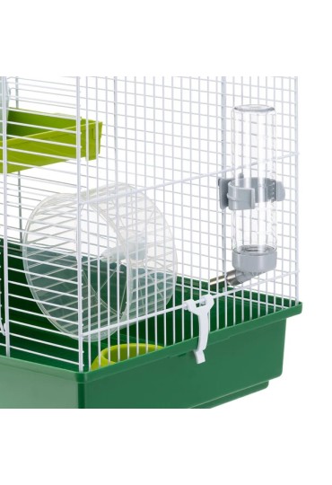 Una casa de dos pisos para pequeños roedores. Hámster Duo es una jaula con una base para la limpieza fácil y una estructura de malla de alambre barnizado de plástico desmontable. Viene completa con accesorios como un bebedero, un alimentador y una rueda. También incluye un estante plástico con una casita y una zona de relax para su hámster, conectada a la planta baja por una escalera.